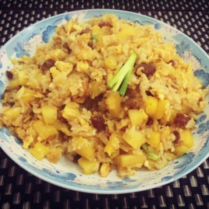 放入米饭翻炒一分钟,加入半瓶椰汁继续翻炒,压碎炒均匀。水快干时即可完工。(太干了上火)