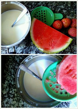 将荔枝拨成小瓣,西瓜去籽用工具研磨成西瓜汁和牛奶混合搅拌均匀。