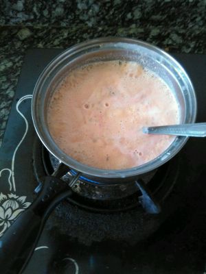 小火慢熬,并不断搅拌,将水汽散发掉,直到边上冒泡烧开时关火晾凉(火不能太大,也不能烧得太开了)。倒入一个能耐低温的容器里,用盖子或者保鲜膜封住,放冰箱冷冻,半个小时后就拿出来搅拌一次,搅散冰渣。