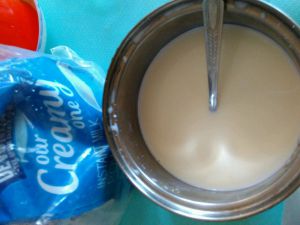 奶粉调成了浓浓的牛奶,加入一个蛋黄拌匀(不要蛋清哦),加入白糖(冰冻后味道会变淡,依照个人口味,可稍微甜点)