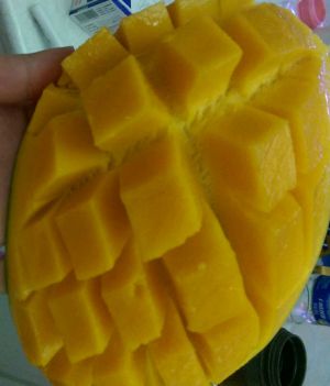 鲜奶油打发至七成,与冷却后的牛奶液以及芒果泥混合在一起,搅拌均匀。