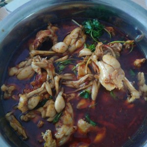第二步:下姜蒜炒香再下大红袍。完加水烧开,下牛蛙多煮会起锅。另起锅热油,蛙里放辣椒面淋油放香菜就好了。