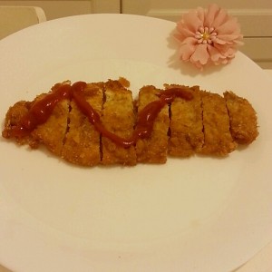 盘子里放面包糠,令鸡肉均匀粘满面包糠。(面包糠制作方法见我的菜谱)