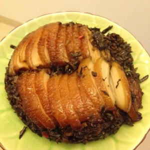 用煎过猪肉剩下的油将梅菜炒好。因为某人不吃辣所以没有放辣椒只放了盐和生抽。之前煮猪肉时盐放的不够所以梅菜稍微放的咸一些。