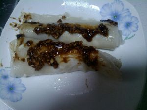 肠粉调料制作:65ml水+0.8克盐+0.25克鸡精+1ml生抽+2ml老抽+0.5克沙茶粉+1.5克白砂糖,在锅内慢火煮沸。