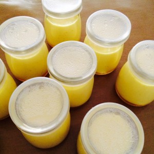 焦糖凝固后倒入9分满的布丁液在布丁瓶里,盖上盖子,放蒸锅蒸20分钟