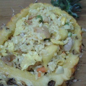 炒匀后盛入菠萝壳里,入烤箱150℃烤10分钟左右,烤至菠萝出香即可!