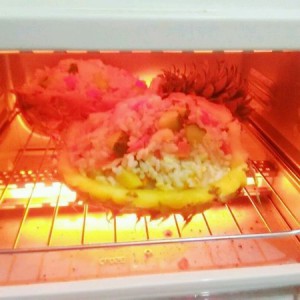 接着就是进烤箱了,开心ing,因为比较匆忙所以没有买芝士片,要不然就是香喷喷的菠萝焗饭了,没有烤箱的同志们可以蒸也可以直接就装盘就吃了,个人认为进烤箱蒸后菠萝的酸酸甜甜的味道出来了很好吃,等待出锅就结束