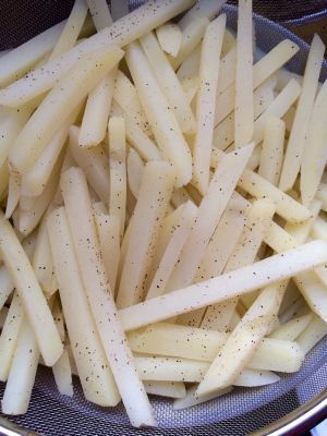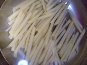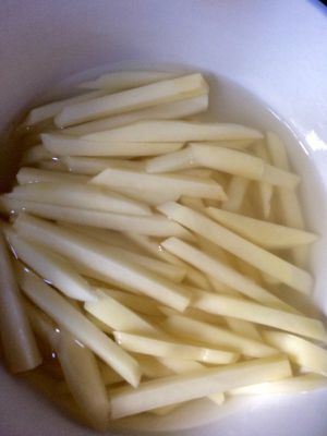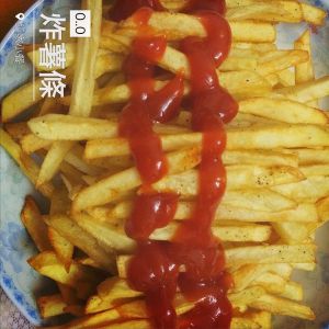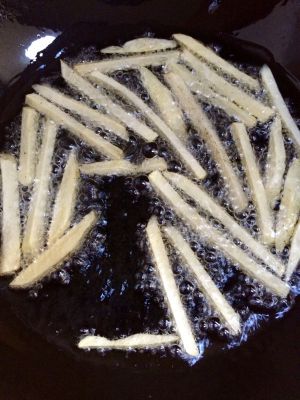 把油烧热,放入薯条开始炸(一次不要放入太多,避免粘在一起),我这个有点少,炸两次就知道量了
