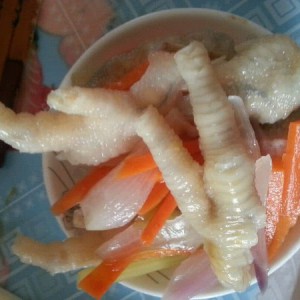 凤爪冷水入锅,放入姜片两片、盐少许同煮10分钟,之后加入米酒在煮1分钟起锅