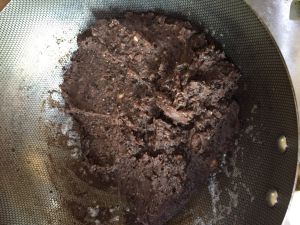 不粘锅加入适量油烧热,小火,将搅好的红豆泥加入锅中翻炒,炒出芝麻红豆香味,即可出锅。