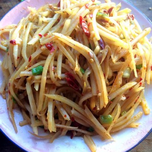 倒入土豆丝,醋,翻炒片刻,待土豆熟后加入盐、鸡精撒上剩下的葱花即可.