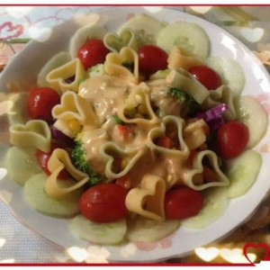 最后在周围放上爱心意面,拌入适量红酒醋和千岛酱即可