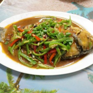 煮的只剩三分之一汤汁时候就可以把鱼盛出来了,调好生粉,把青红椒放入汤中炒30秒就可以淋在盘中的鱼身上。(也可以单独把青红椒炒熟备用,后面直接放鱼身,淋上汁就可以了。)