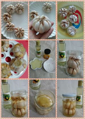 蒜头剥衣,留最里面那层,泡清水一小时,洗净,倒扣放凉架上凉上12小时,彻底凉干,把硬的头部切掉