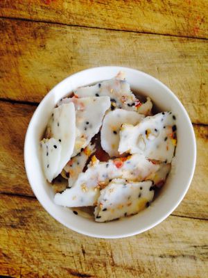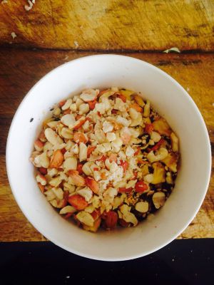 准备好要放入的材料,可以根据个人喜好添加,我添加的是花生仁,葡萄干,芝麻,山楂片,香蕉片
