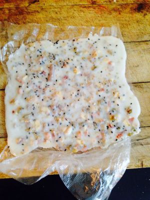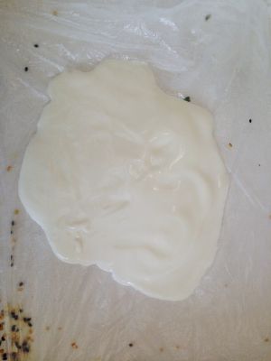 把冰箱里面放入一张保鲜膜,在保鲜膜上倒入酸奶。