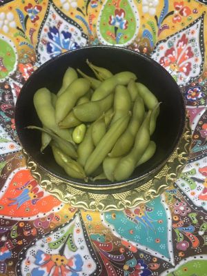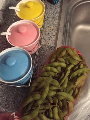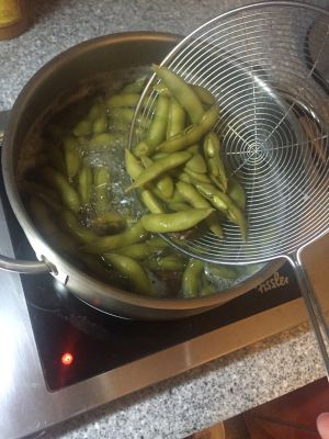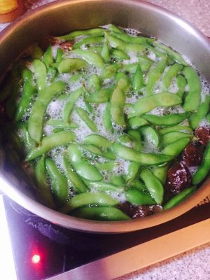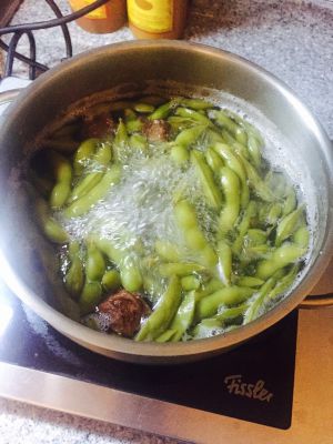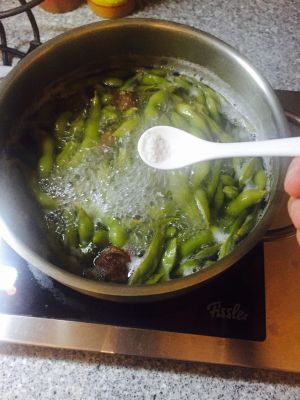 水烧开后,放话梅煮,然后再放毛豆。话梅和毛豆的比例大概1:10。