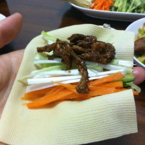 将猪上肉,青瓜,胡萝卜,大葱,香菜切丝,豆腐切方块,放盘待起。