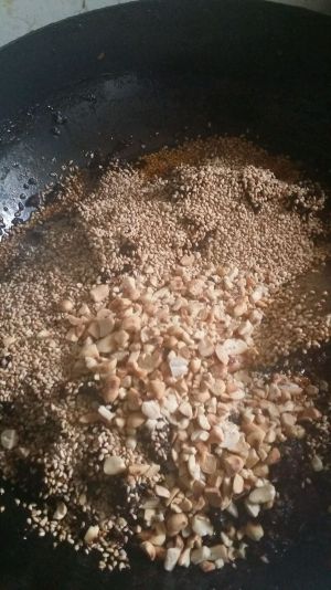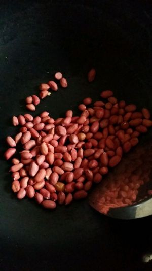 花生小火炒熟去皮,放保鲜袋里敲碎