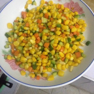 放入适量油 在放入玉米盐糖适量 最后放入胡萝卜黄瓜翻炒 出锅即可