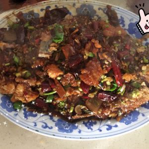 鱼煎至两面金黄后关火,放入辣椒段炸香。