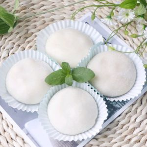 舀一勺糯米粉在锅中炒熟,撒在案板上防粘。 把糯米糍分成小等份。