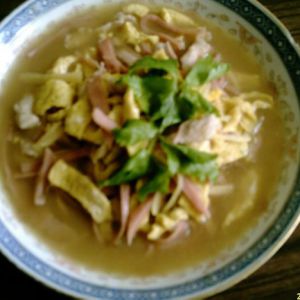 在锅中放入色拉油,先把肉放进去,翻炒,再放入火腿、鸡蛋;加入生粉水、鸡精、味精、盐
