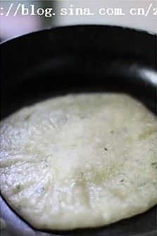 用最小火将飞饼煎至饼的边缘开始明显鼓起(如是不沾锅可不刷油,普通锅请在锅底刷少许油),此时可翻面;