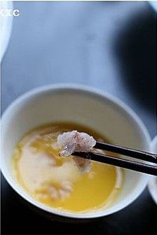 用筷子将饼皮稍稍抬起,另一手将虾仁蛋液倒入饼中,并使蛋液均匀滑开;