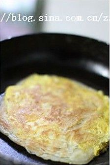 继续用小火烙饼,烙至蛋液半凝固状,再翻面;