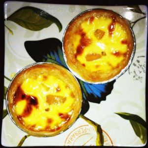 将牛奶、奶油、绵白糖隔水溶化、加入5个蛋黄搅匀、制成蛋挞水、