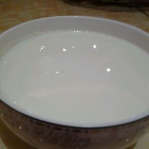 把煮好的牛奶晾到结奶皮为止,延碗边把牛奶倒进蛋清,搅拌匀