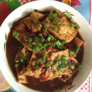 大火煮至收汁装盘,撒上葱花,一道美味的豆腐便出炉啦