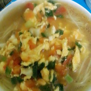水开后放入葱煮一小会待番茄熬烂盛出放入小碗