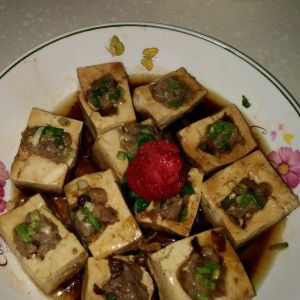 先将豆腐切成块,中间挖空装上剁好的肉末,肉末用姜.葱.五香粉.淀粉.盐,生抽拌好。豆腐装盘。