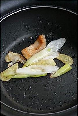 另起一个稍微小一点的锅,放入肥猪肉10克,煎至出猪油后,就加入葱、姜段爆香。