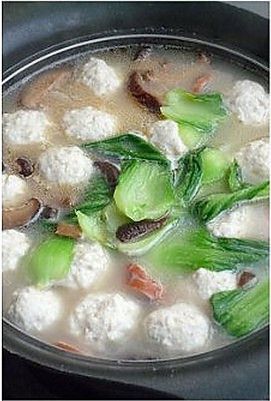 然后再放入鱼丸、菜心、盐、葱姜汁水淀粉,再次的煮开后淋几滴花雕酒跟麻油后即可出锅。