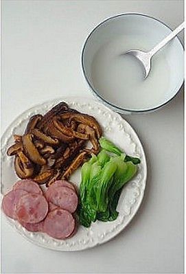 将油菜心在加了盐的开水里焯熟,香菇切成条状,火腿切片,淀粉中加入葱姜水调匀。