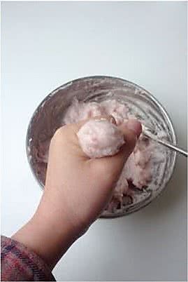 用手抓一把丸子茸,在虎口处挤出丸子形状。