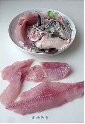 去掉鱼皮跟带鱼刺的部分。黑鱼皮很厚特别好剔下来,鱼骨鱼皮留着煮汤。