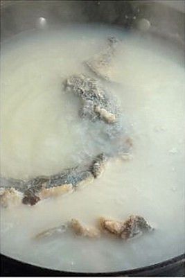 炒锅中加入少许油,热后放入鱼头鱼骨鱼皮稍煎,变色即可。