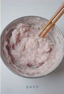打好的丸子茸中加鸡蛋清1个,葱姜汁水淀粉2大勺,盐1克,花雕酒几滴。