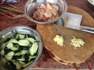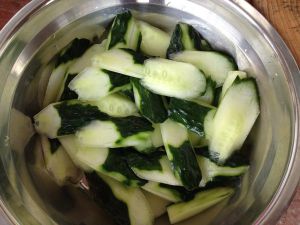 黄瓜,去掉一步分皮,然后纵切一开四,去瓤,斜刀切成块。然后放点盐腌5分钟,注意盐的份量。