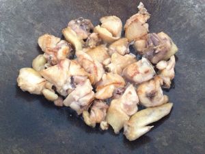 锅加热,放点油,把鸡煎至两面金黄,关火,撒入蒜米,闻到香味后盛起备用。