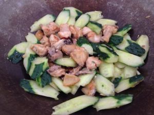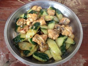 姜米下锅爆香,放入黄瓜,加点盐和糖,略炒一会,再加入鸡块,翻炒两下,酒几滴料酒,盖上锅盖,调中火加热30秒。