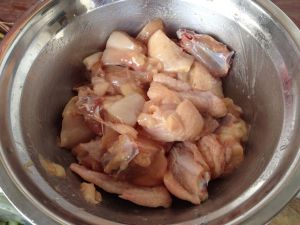 鸡,洗净,切块,糖,盐,酱油,料酒,玉米粉,油腌味15分钟。腌味的时候带一次性手套,用手把味料抓匀。