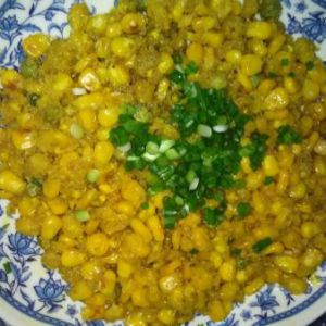 把蛋黄放入锅里煎下在放入炸好的玉米,反炒均匀放入白糖,起锅放入葱花即可