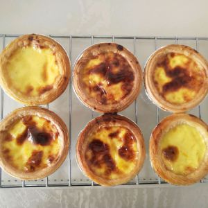 然后将蛋挞液放入蛋挞中,蛋挞液可以刚刚好放进六个蛋挞皮中。(蛋挞皮是在外面买的)