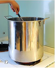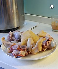 重新放入大汤锅中,加入10千克清水,大火烧开后,去浮沫,加入老姜、胡椒粒,用小火炖8小时